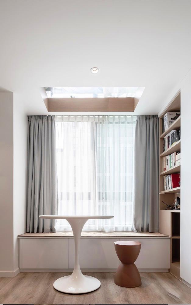 阳台设计成卡座形式,同时也是一个储物柜,旁边层板处摆放各种书籍,搭配一个现代化造型的圆桌和圆凳,既可以用来吃饭用餐,也可以是读书学习的好地方。